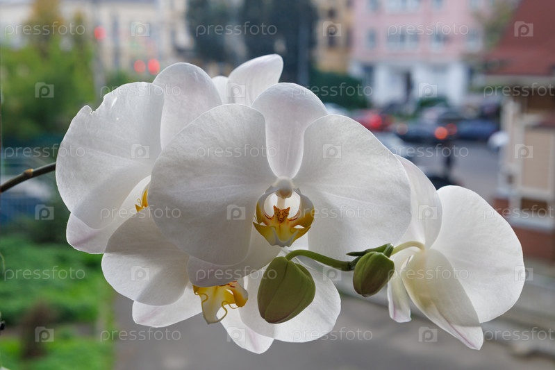 Цветок белой орхидеи на фоне городской суеты