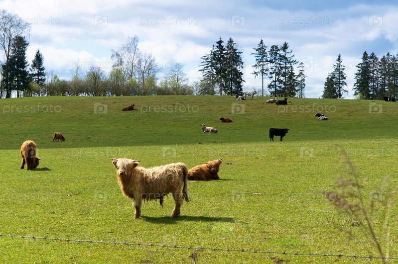 Шотландские горные коровы пасутся в поле возле леса, разводят скот, занимаются животноводством