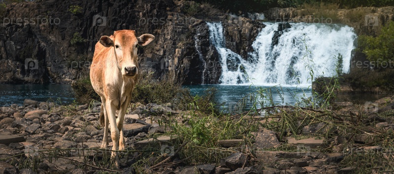 Корова у красивого водопада Тад Фаед. Лаосский пейзаж. Панорама