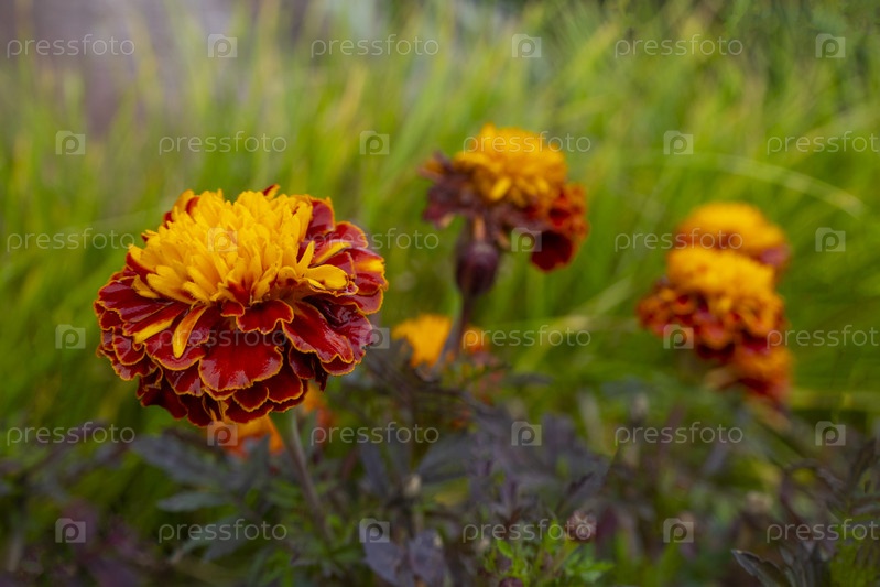 Осенняя концепция. Цветение черносрезанных бархатцев в осеннем саду в солнечный день