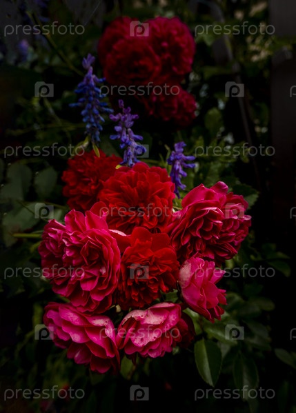 Красивые розы на темном фоне. Пышный куст розовых роз с темной виньеткой
