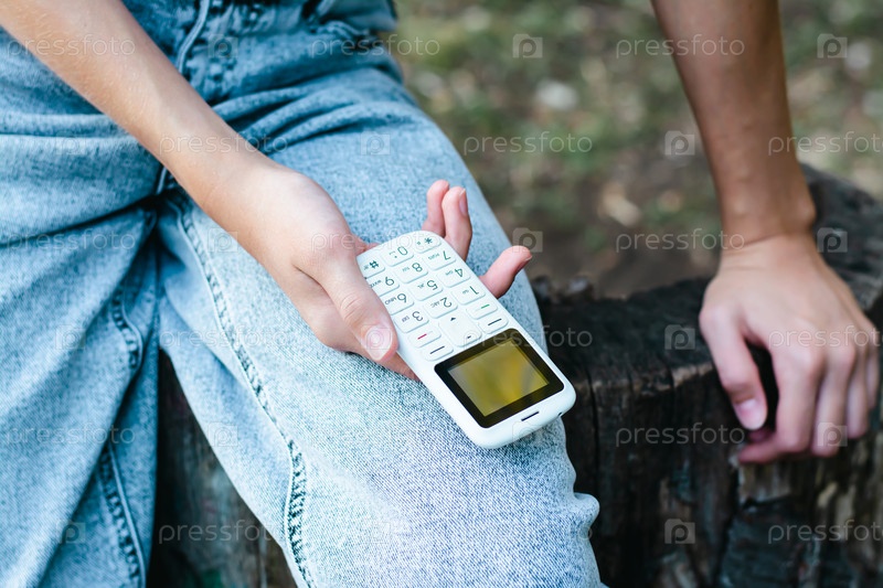 Выбросить телефон в руку девушки в джинсах, стоящей на коленях