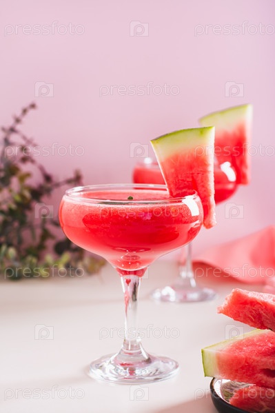 Освежающий арбузный коктейль с мятой в стаканах на столе, вертикальный вид