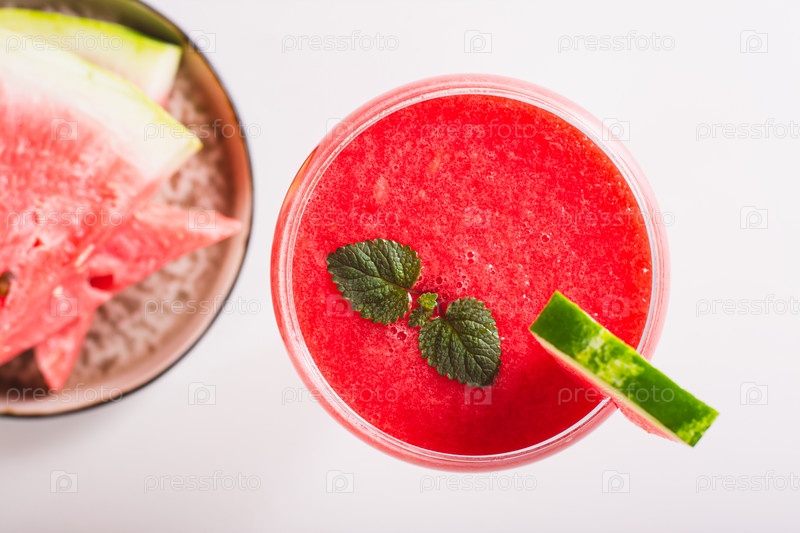 Крупный план освежающего арбузного коктейля с мятой в стаканах на столе