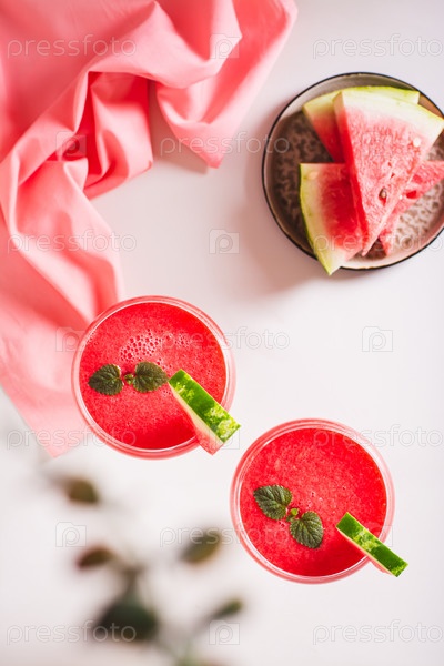 Арбузный лимонад с кусочками арбуза в стаканах на розовом фоне сверху и вертикальный вид