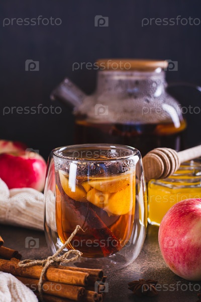 Горячий чай с яблоками, корицей, анисом и медом в чашке и чайнике на столе, вертикальный вид