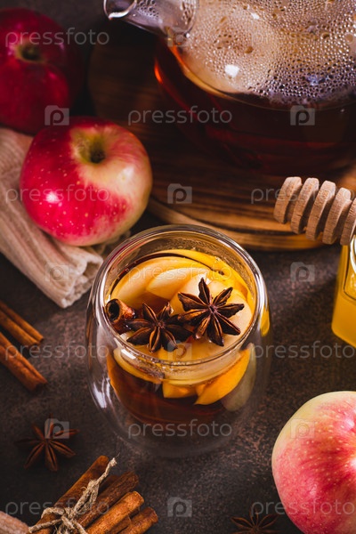 Яблочный чай с корицей, медом и анисом в чашке и чайнике на столе, вертикальный вид