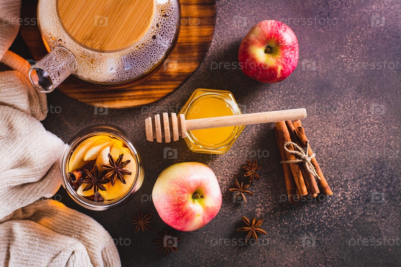 Горячий чай с яблоками, корицей, анисом и медом в чашке и чайнике на столе