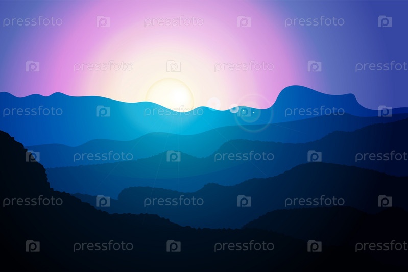 Рассвет в ясном небе над холмами. Векторная иллюстрация. Пейзаж