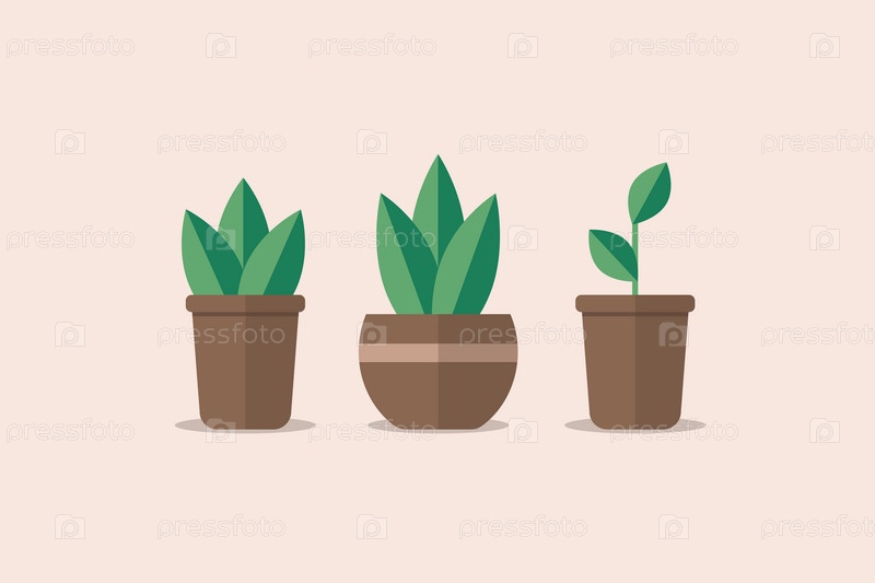 Простые растения с листьями в горшках. Набор из трех растений в горшках. Садоводство, уютный дом, детали интерьера, натуральность