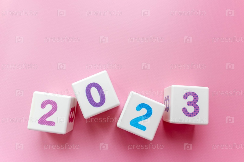 Кубики с красочными цифрами 2023 на розовом фоне с копировальным пространством