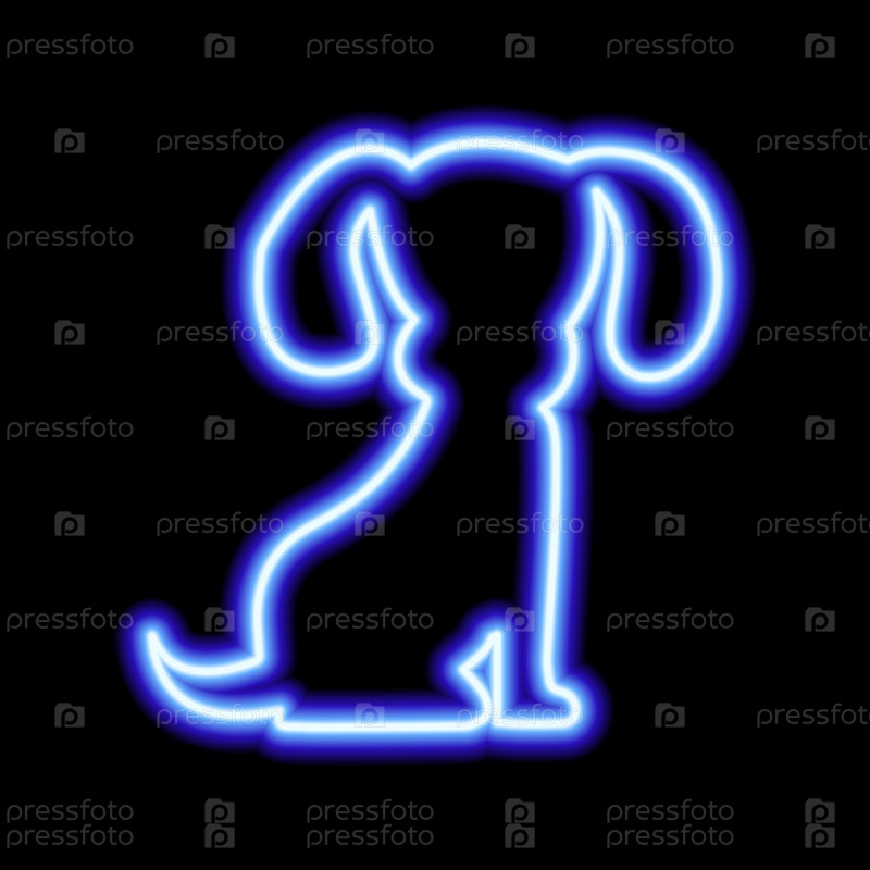 Голубая неоновая вывеска сидящей собаки на черном фоне