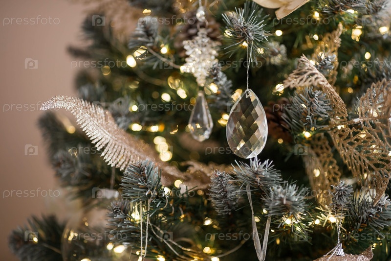 Стильные стеклянные хрустальные прозрачные игрушки на елку. Бежевые тона. Баннер для дизайна веб-страницы. Концепция стильного Нового года и Рождества 2024
