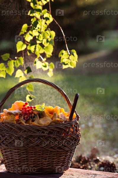 Благородные, съедобные грибы лисички. Желтые лисички в красивой плетеной корзине в березовом лесу под дождем. Красивая текстура природного фона