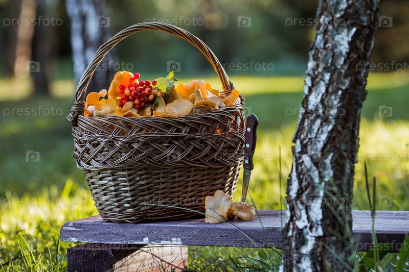 Благородные, съедобные грибы лисички. Желтые лисички в красивой плетеной корзине в березовом лесу. Красивая текстура природного фона