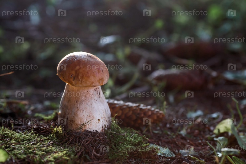 Благородный, королевский гриб. Подберезовики белые. Белые грибы в еловом лесу. Красивая текстура природного фона