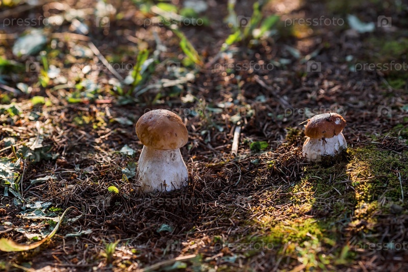 Благородный, королевский гриб. Подберезовики белые. Белые грибы в еловом лесу. Красивая текстура природного фона