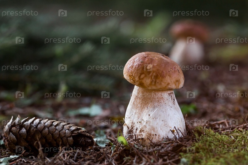 Благородный, королевский гриб. Подберезовики белые. Белые грибы в еловом лесу. Красивая текстура природного фона