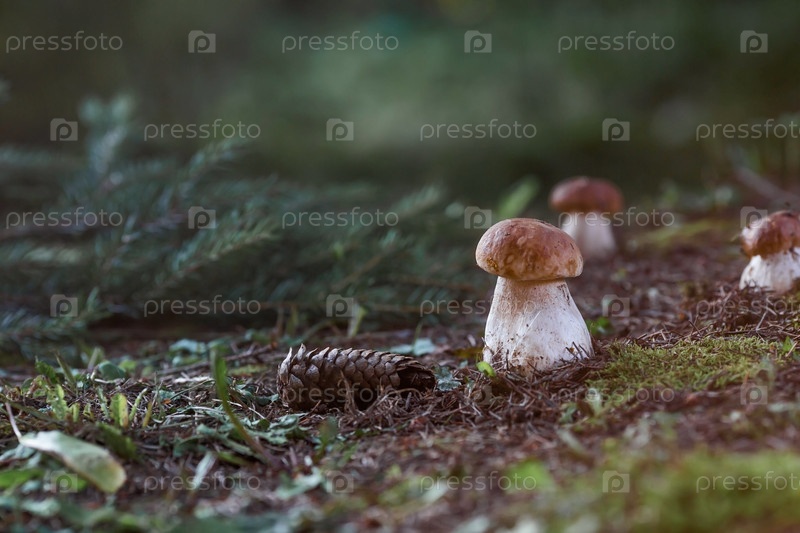 Благородный, королевский гриб. Подберезовики белые. Белые грибы в еловом лесу. Красивая текстура природного фона