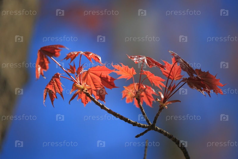 Весна. Ветка красного клена с молодыми листьями