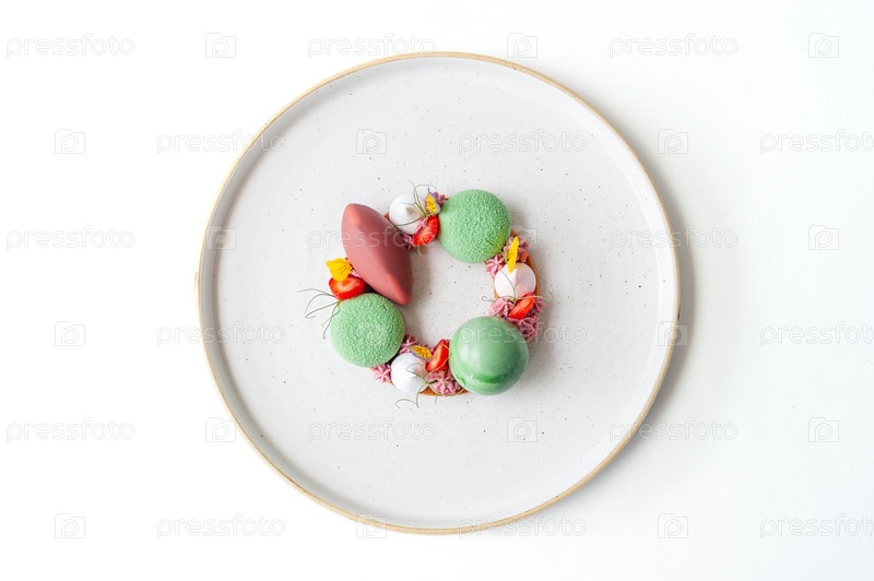 Яркий десерт на белой тарелке с клубникой и муссом