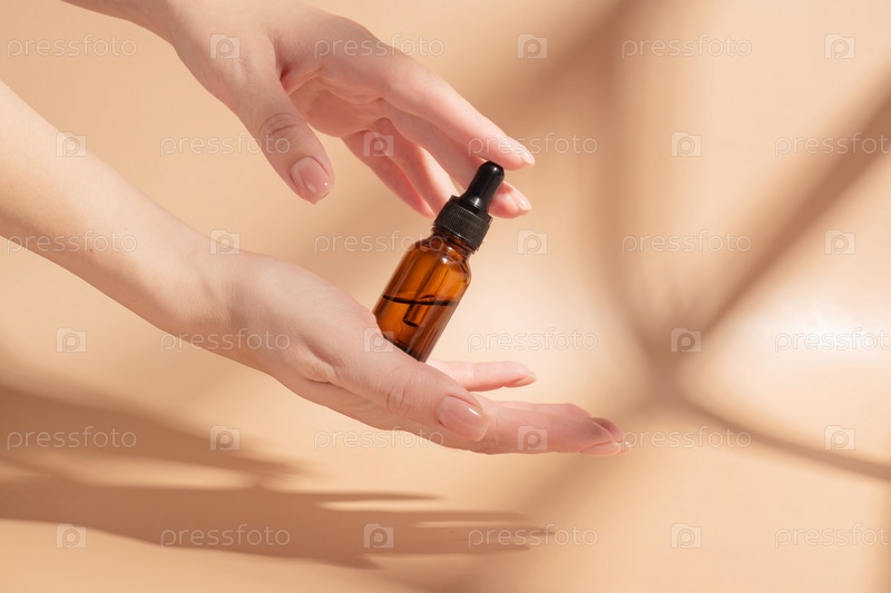 Флакон-капельница с сывороткой красоты в женских руках. Процедура по уходу за кожей, распорядок дня для здоровой кожи