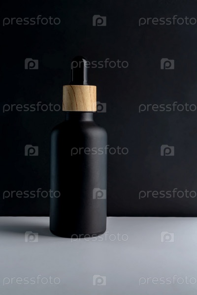 Косметическая бутылочка из темного матового стекла с капельницей на черном фоне. Концепция натуральной косметики, натуральное эфирное масло и средства по уходу за кожей, макет