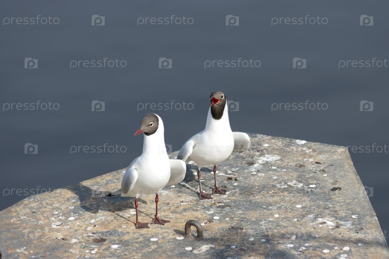Пара рычащих озерных ястребов (Chroicocephalus ridibundus) на опоре моста