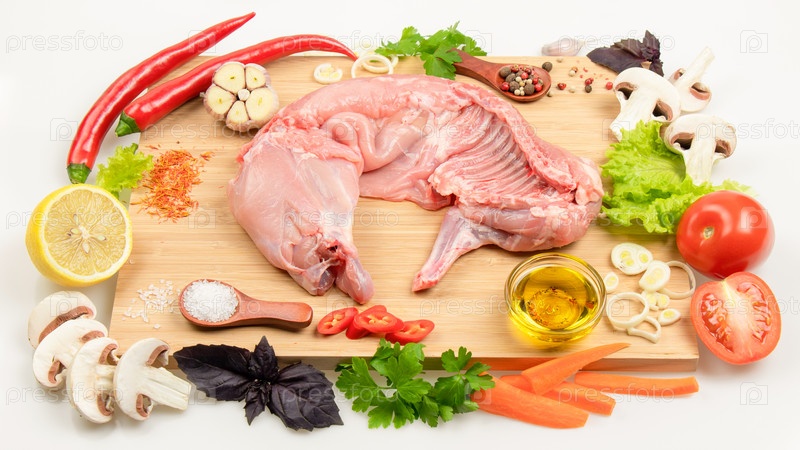 Половина сырой тушки кролика в окружении кулинарных ингредиентов на разделочной доске. Изолированные на белом фоне