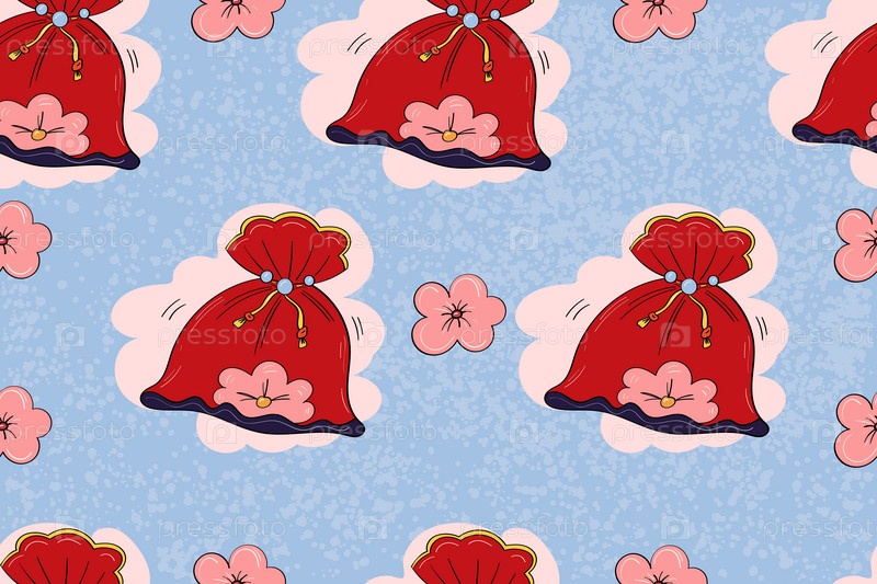 Денежный мешок и цветок сакуры для счастливого Китайского Нового года бесшовный паттерн