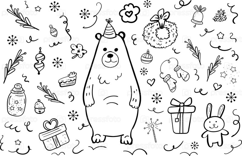 Раскраска с медведем и зайцем, новогодними подарками и украшениями