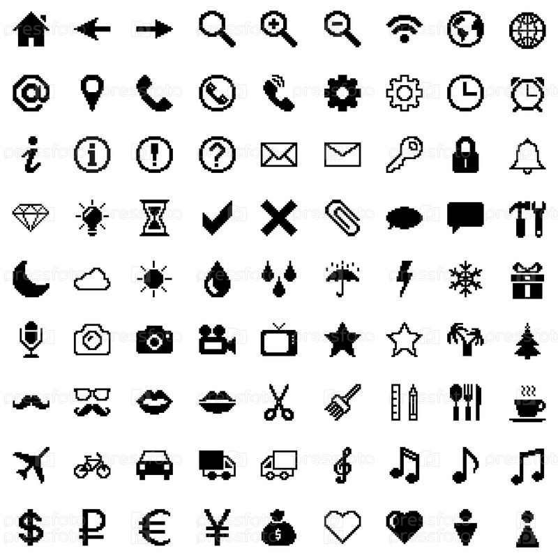 Набор пиксельных иконок: интернет, паутина, погода, валюта, транспорт