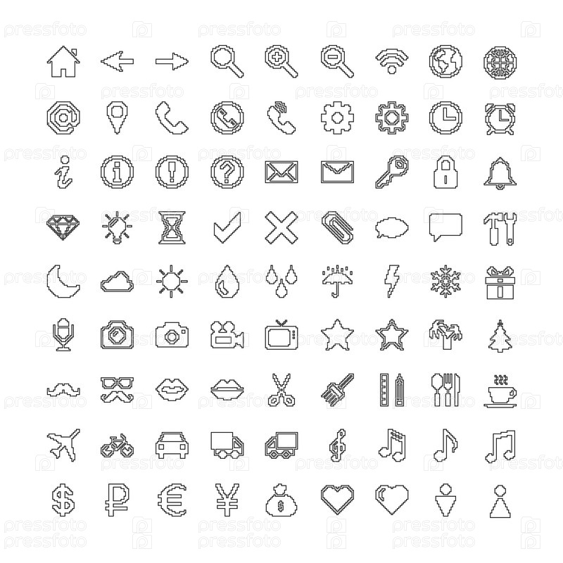 Набор значков пиксельных линий: Интернет, паутина, погода, транспорт