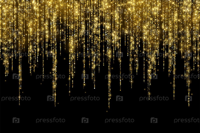 Золотое праздничное украшение, длинная блестящая гирлянда на черном фоне. Вектор