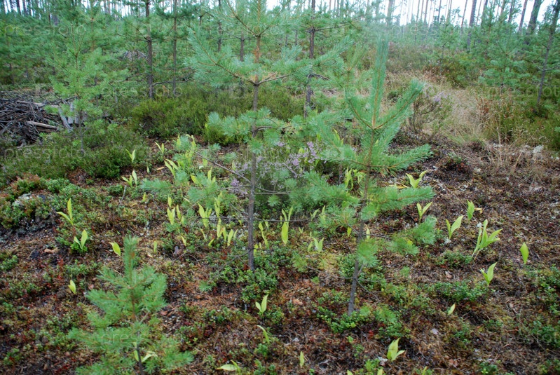 На лесной поляне растут ландыши. На небольшой опушке среди мха, вереска, ежевики и других растений проросли ландыши. Из земли торчат несколько широких зеленых листьев
