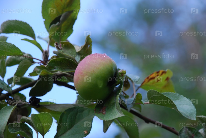 Зеленое яблоко на яблоне