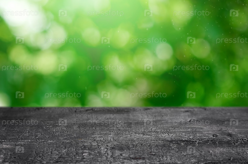 Черный деревянный стол на зеленом размытом фоне