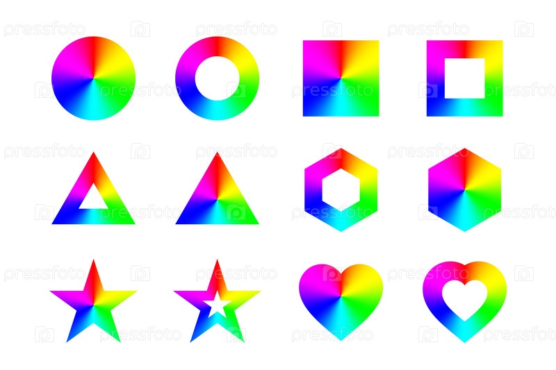 Геометрические формы и рамки с коническим радужным градиентом, изолированные на белом фоне. Вектор