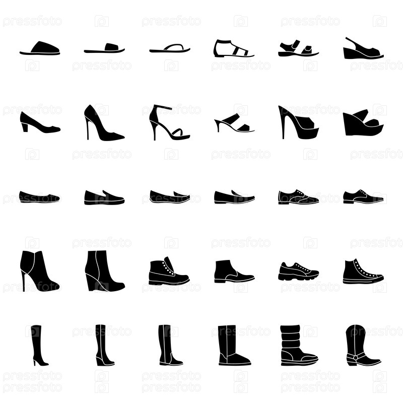 Набор иконок мужской и женской обуви, черный силуэт