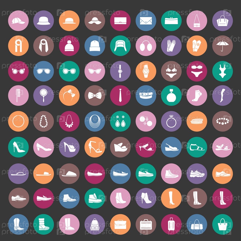 Значок силуэта обуви и аксессуаров. Набор векторных иконок: обувь, сумки, шляпы, украшения, очки