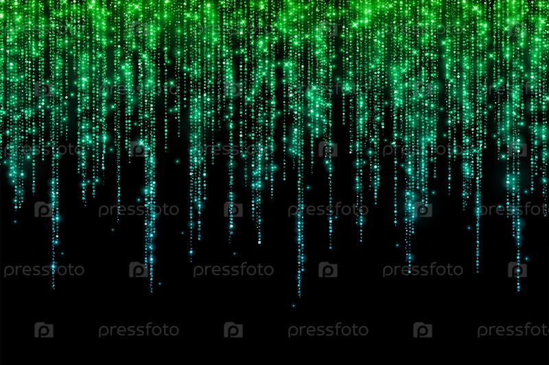 Зелено-синяя праздничная блестящая длинная дождевая гирлянда на черном фоне. Векторная иллюстрация