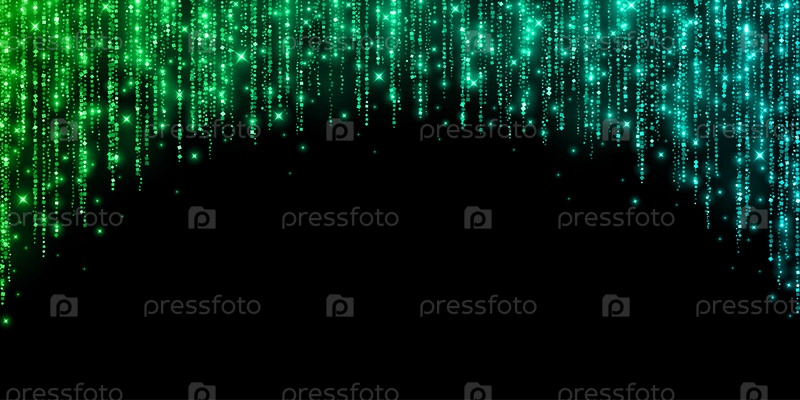Сине-зеленая праздничная блестящая гирлянда из дождевой дуги с блестками на черном фоне. Векторная иллюстрация