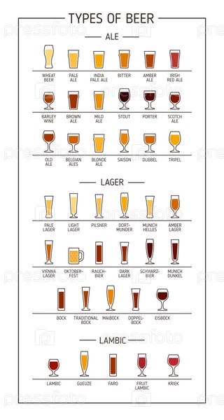 Виды пива. Различные сорта пива в рекомендуемых стаканах. Векторная иллюстрация
