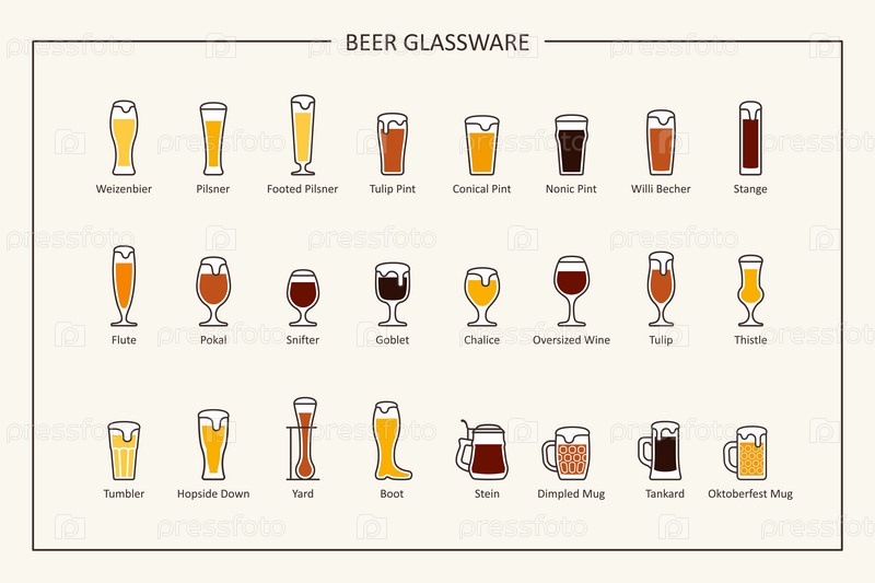 Путеводитель по пивной посуде, цветные значки. Горизонтальная ориентация. Вектор