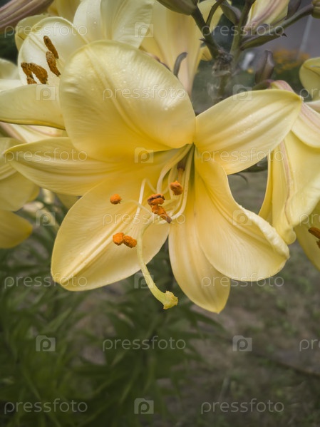 Показан крупный план желтого цветка лилии с тычинками и пестиком, цветущим в саду