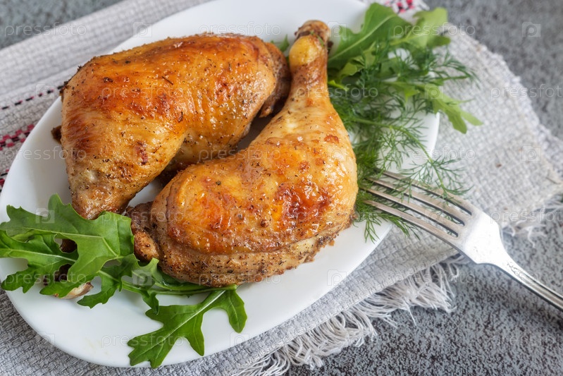 Запеченная куриная голень на тарелке с зеленью