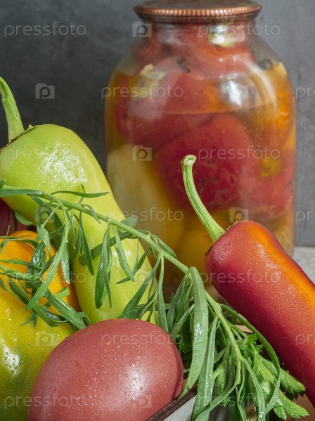 В стеклянных банках консервированный болгарский перец, рядом коробка с перцем и другими овощами. Вид спереди, крупный план