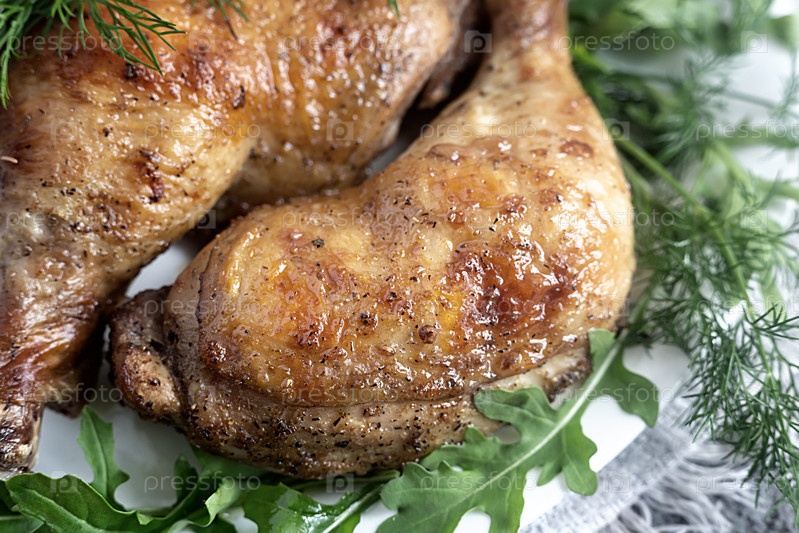 Запеченная куриная голень на тарелке с зеленью