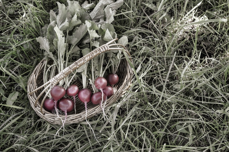 Пук свежей красной редьки с листьями в плетеной корзине на зеленой траве в саду. Сбор урожая