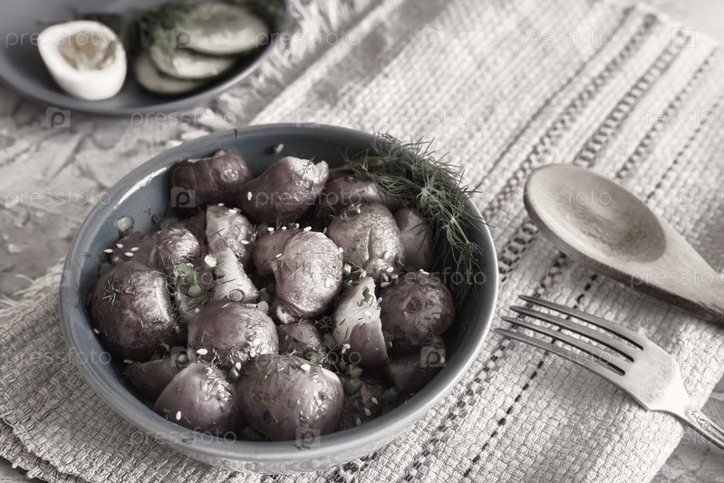 На столе на тарелке запеченный редис с зеленым луком и зеленью. Представлено крупным планом